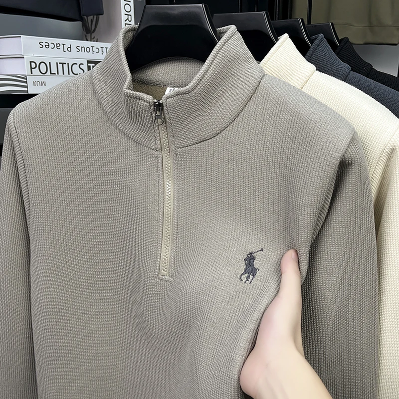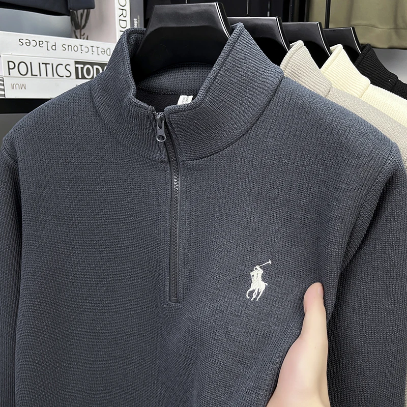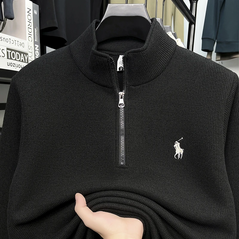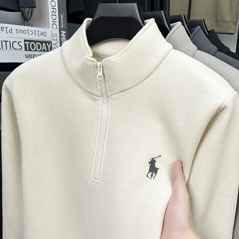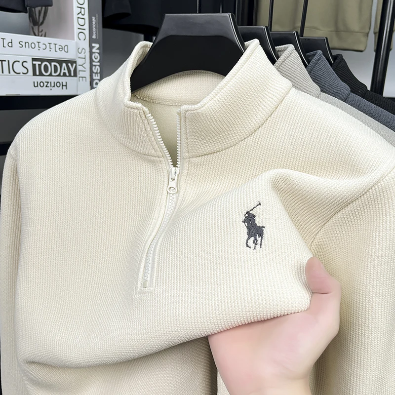 Half Height Zipper and Plush Thick Hoodie for Men in Autumn and Winter Anti Pilling Embroidered Horse Logo Hoodie Top